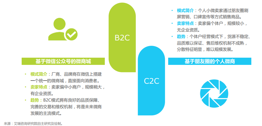 B2C模式机制完善,C2C模式规模发展较难,按照零售终端代理主体的不同,微商可以分为B2C模式和C2C模式。B2C模式是指基于微信公众号的微商商城,C2C模式是指基于朋友圈的个人微商。B2C与C2C模式都是独立于传统电商平台的存在方式,在正常的社会交往中实现商品交易,代表着去层级化的交易模式。