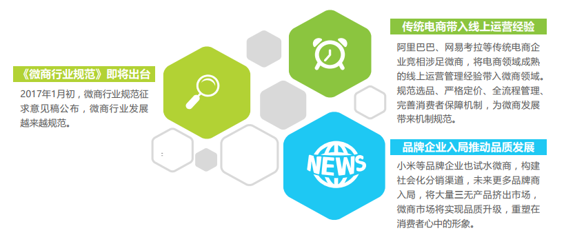 立法推进,品牌入局推动行业规范发展,2017年1月初,微商法律规范征求意见稿公布,标志第一部微商行业法规即将诞生。与此同时,阿里巴巴、网易考拉等传统电商企业竞相涉足微商,将电商领域成熟的线上运营管理经验带入微商领域;小米品牌企业也试水微商,构建社会化分销渠道。未来随着更多电商、品牌的涉足,微商行业商品品质将得到更好的保障,恶意精品屏的营销方式也将得到规范。基于熟人关系的商业变现将重新建立在“真实信任”的基础上发展,微商行业将逐步走向规范化和品牌化,实现微商升级。