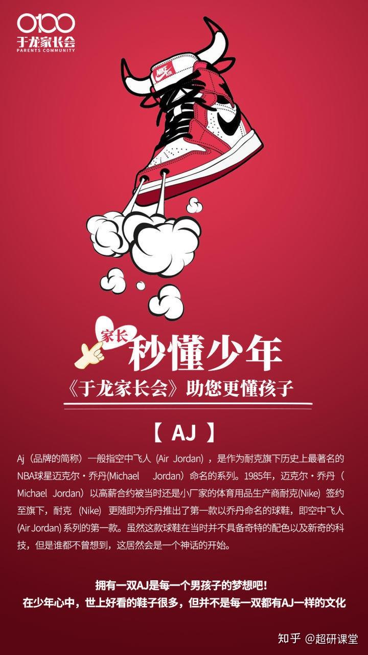 Aj(品牌的简称)一般指空中飞人 (Air Jordan) ,是作为耐克旗下历史上zzui著名的NBA球星迈克尔·乔丹(Michael Jordan)命名的系列。1985年,迈克尔·乔丹(Michael Jordan)以高薪合约被当时还是小厂家的体育用品生产商耐克(Nike) 签约至旗下,耐克 (Nike) 更随即为乔丹推出了第一款以乔丹命名的球鞋,即空中飞人 (Air Jordan) 系列的第一款。虽然这款球鞋在当时并不具备奇特的配色以及新奇的科技,但是谁都不曾想到,这居然会是一个神话的开始。 于龙家长会:拥有一双AJ是每一个男孩子的梦想吧! 在少年心中,世上好看的鞋子很多,但并不是每一双都有AJ一样的文化 于龙家长会让父母和孩子相互了解,相互理解