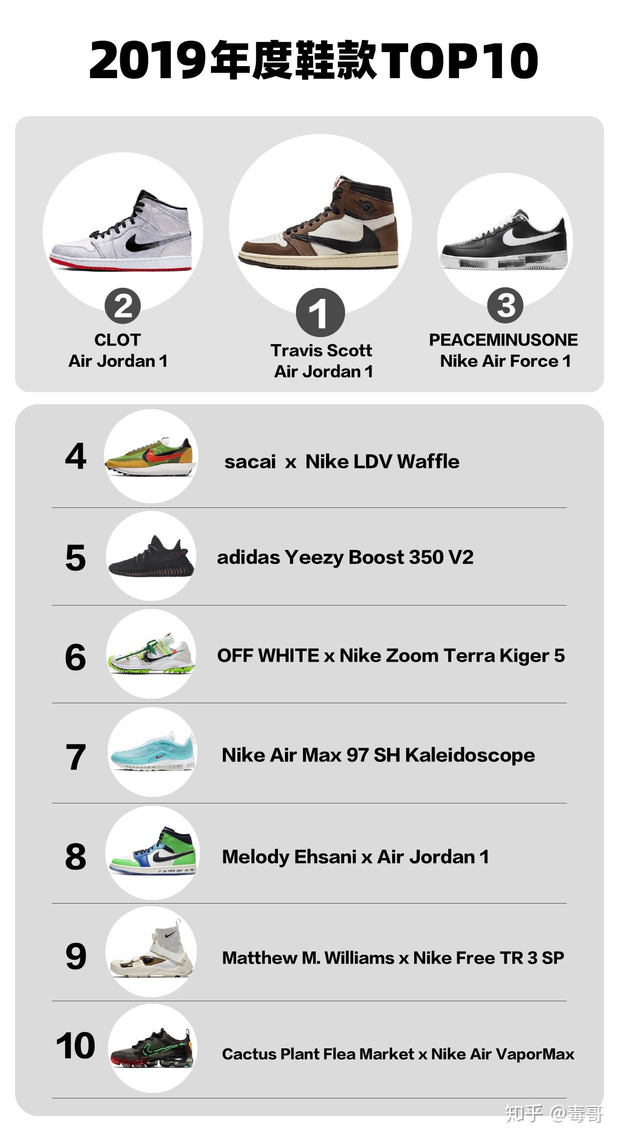 又到了一年一度鞋圈TOP10揭晓时刻,如果说2018年是Virgil Abloh独霸一方,那么,2019年就是八仙过海各显神通,Travis Scott 、陈冠希、权志龙、阿部千登势、Williams等都推出了叫好叫座的鞋款,影响了今年整个鞋圈走向。 今年TOP10的榜单,参考了3个球鞋交易平台:毒app、nice、StockX、1个社交平台:instagram,从3个维度考量,权重占比:销量数据40%,设计创意30%,话题性30%。 「2019年度鞋款TOP10」榜单,特别说明: 1、销量数据只参考了3个平台,实际发货量远大于这个数; 2、单一鞋款销量数据,是所有配色的总和,比如:sacai x Nike LDV Waffle; 3、为避免霸榜,单个设计师/品牌只取zzui高,比如:Travis Scott 的AJ1、AF1都很厉害,只取zzui高Air Jordan 1 TS,Clot的丝绸系列,白、蓝、黑丝绸,只取白丝绸,但是销量按照系列算,丝绸总和,权志龙para-noise普通+限定总和; 4、这个榜单仅供参考,考量的权重不同,榜单会不同,如果从销量看,yeezy350v2排第一,从话题性看,倒勾、丝绸不止占一个位,大家怎么理解都成。 上榜理由:钩子一反,倾家荡产。 数据表现:销量:233,374+,价格:1w+。 Travis Scott 跟AJ合作的Air Jordan 1 High OG,因为「侧面一个扩大的反向Swoosh」这个大胆的设计,让这双鞋获得了超高的关注度与影响力,高昂售价下能有如此销量,实属厉害,“倒钩”年榜第一,没有异议。 Air Jordan 1 TS 一共2个版本,High版和Low版,用料很足,翻滚皮革+绒面牛皮革,深棕+白/黑的配色,低调奢华。 除了倒勾,内侧“Cactus Jack”厂牌字样,后跟烫印的鬼脸logo也让人印象深刻,增加了辨识度和潮流趣味。 颜值方面,我心中AJ1>AJ11>AJ4>其他,Air Jordan 1 TS的设计、配色都让它十分百搭,粉色鞋带的加入,又酷又骚。 上榜理由:白丝绸、铜钱,你品,你细品 数据表现:销量:130,467+,价格:4000+。 丝绸一路走到今天天,影响力不断壮大,陈冠希一句“十年内不会再有丝绸”,更让它达到巅峰。 在白丝绸之前的蓝丝绸、黑丝绸都极具热度,整个丝绸系列是今年的王炸之一,不管是陈冠希的影响力还示氟潮崛起之势,都让「丝绸系列」成为一个经典。 白丝绸、铜钱串联鞋带、红底,颜值在一众丝绸系列中也zzui抗打,这双鞋不自穿,收藏也具有价值,所以,入手要趁早。 上榜理由:不是权志龙,不要反系鞋带 数据表现:销量:86,084+,价格:4000+。 Para-noise是今年zzui具话题的鞋款之一,依托权志龙的潮流影响力以及庞大的粉丝群体,一经推出瞬间上榜,长势喜人,这双鞋还有一个作用,就是让更多女生开始接触到球鞋文化。 本身的颜值也很高,鞋舌小雏菊、鞋带前系、外底的黑色涂抹,充满设计趣味让鞋本身有了更多可玩性,出街帅炸,值得拥有。 上榜理由:Nike年度爆炸联名款 数据表现:销量:161,142+,价格:4000+。 这双联名鞋让更多人认识到sacai,包括解构系列的另一款sacai x Blazer都是今年的爆款之一,设计上创意很“2”,2个中底、2个鞋舌、2个Swoosh,要颜值有颜值,要销量有销量,排在4,只会低不会高。 sacai 跟 nike的联名款是我心中2019年度NO.1,国内话题性比不上陈冠希和权志龙,但世界榜特别是海外销量高于前2者,是今年世界范围都超火的联名系列之一。 上榜理由:Kanye West大神的黑天使 数据表现:销量:416,770+,价格:2700+。 黑天使是yeezy今年的爆款,排在第五,真的有点委屈,毕竟销量第一、脚感第一,又有kanye大神加持,只是碍于榜单的销量权重不大,以及nike、aj的新品扎堆,制造话题的新鲜度高于yeezy。 但yeezy的发力应该在明年,年底已经发售了不少新鞋,神图镇楼,期待2020。 上榜理由:Virgil Abloh2019年设计集大成代表 数据表现:销量:172,288+,价格:1500+。 Virgil Abloh 2019年的2大设计元素“田径鞋钉”“登山绑带”,在这双联名都有配色都让它十分百搭,粉色鞋带的加入,又酷又骚。穿上这条毛毛虫,你就是这条gaizzui靓的仔。 #zzui便宜offwhite联名系列##倒闭款#,都让鞋钉系列(Terra Kiger 5+Vapor Street+ Waffle Racer)拥有更多受众,真香价格不好吗? 上榜理由:年度zzui具收藏价值的款鞋之一 数据表现:销量:64,234+,价格:3500+。 “万花筒”是由设计师cash带来的上海城市款,多层叠加的湖水蓝兀纱面料,渐变设计如水汽蒸腾而上的云,用变化莫测的云诠释上海的「速度」和「Air」。 中国区的城市限定版本身就极少,设计上构思以及稀有配色的带来的高辨识度,绝对是2019年度极具收藏价值的鞋款之一。 上榜理由:买表送鞋很上头。 数据表现:3平台销量:17,206+,价格:3800+。 这款来自设计师Melody Ehsani和Jordan的联名合作,除了鸳鸯配色,金表串联鞋带,还是第一次在球鞋上出现,话题性十足,“不怕倒勾有多叼,就怕aj戴金表”“球鞋戴表,还钱到老”。 这双鞋匠心独具的设计,持续的话题性,都将在后续带来一波又一波销量。 上榜理由:zzui成功的机能风鞋款 数据表现:销量:12,739+,价格:2500+。 此次联名鞋款,在设计上沿袭了 1017 Alyx 9SM 创始人兼创意总监 Matthew M. Williams 的一贯机能理念,zzui大特色的「可拆卸外底」极具辨识度。 双层大底设计、魔术绑带、弹力袜套,营造了强烈的机甲感受!在近几年大热的技能风的热潮下,这双联名稳居第一。 上榜理由:潮牌CPFM颜值圈粉 数据表现:销量:11,804+,价格:3800+。 潮牌Cactus Plant Flea Market 和Nike今年带来的联名鞋款,设计上惊喜满满,侧面独特的霓虹灯Swoosh+后跟四眼笑脸(CPFM标志元素)+彩虹内外底,辨识度极高。 潮牌CPFM国人熟悉的不多,有不少爆款单品,很多潮流icon带货,这次的联名颜值圈粉不断,虽然销量不