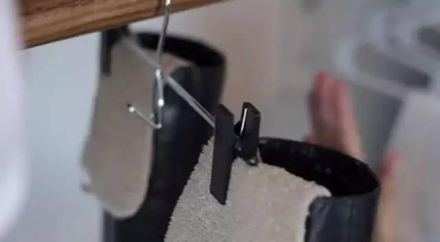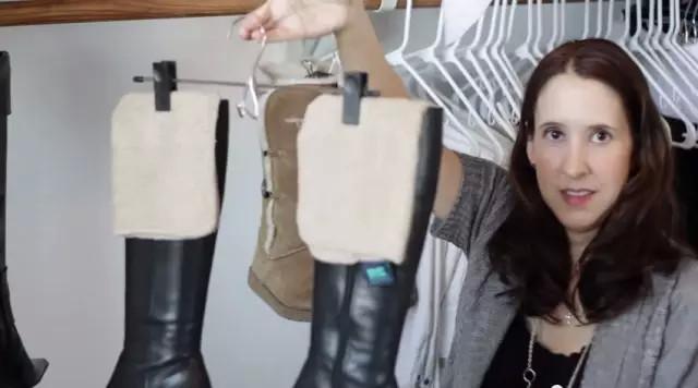 而常穿靴子的季节,很多地方会推荐你在鞋柜里留出这样一个横杆来挂鞋,同时用各种各样的东西撑住里面,比如这种可以挂的鞋撑: