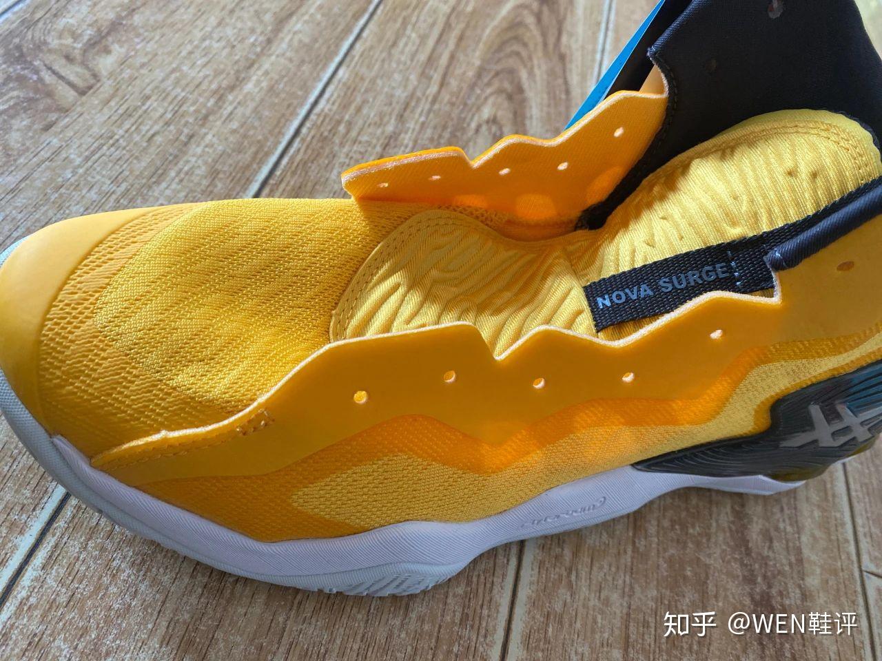 今天要给大家带来的是亚瑟士今年的旗舰款产品:Asics Nova Surge的开箱测评,还是先来看看这双鞋的基础信息吧。 基础信息尺码:US9 EUR42.5发售价:1290市场价:900单只重量:489克有无偏码:内长偏长 建议买小半码 这是亚瑟士今年的篮球鞋款式中zzui昂贵的一款了,定价达到了1290,市场价格也是900多。我觉得很多朋友会发出和我一样的疑问:它凭什么这么贵?那今天这期节目,我们就是好好揭开它的面纱。 鞋盒就还是亚瑟士这种zzui普通的鞋盒,就不说了。 这款Nova Surge其实是亚瑟士今年推出的一个新品类,像之前的Gel Hoop都是第12代了。这双鞋是沿袭了之前BLAZE NOVA的系列而推出的。这双鞋拿到手里的第一感觉就是很“笨重”。毕竟习惯了一贯轻质化的其他鞋款,这双单只接近500克的球鞋着实有点令我意外。 但是有一说一,这双鞋从外形上看,要比Gel Hoop以及Gel Brust“篮球鞋”多了。 鞋面上,主要材质还是比较透气的工程网布,同时在鞋头的位置,以及鞋带扣的周围,都有热压的加固处理。 鞋舌和两侧的鞋身其实是分开的,鞋身的两侧用到的是很硬质的材料,手感会让我觉得和海沃德鞋面上的质感差不多。应该都是那种比较硬质的编织处理。 因为分离式鞋舌的原因,使得这双鞋对脚型的要求非常友好,高脚背的朋友再也不用担心穿不进去了。 整双球鞋一共是有7组鞋带扣,鞋带扣之间的间隙比较大,所以整体的包裹感还是不错的。 后跟方面,海绵填充也是比较厚实的。 只看后跟我会觉得和之前Nike的高帮球鞋有很多相近的地方,远的不说就比如前年的Hyperdunk。这样的后跟往往对脚踝的包裹锁定都会有着很大的提升。 同时这里还有一块非常硬质的外置TPU,进一步加强了后跟的锁定支撑,上面也是有着亚瑟士的logo。中底方面,全掌的FLYTEFOAM已经后掌GEL的缓震。 作为亚瑟士实战鞋中zzui常见的FLYTEFOAM,我觉得已经不用过多描述了。这次同样,前掌比较薄,比较贴地,便于启动,后掌比较厚,提升缓震。 同时整个中底都上翻到了鞋面上,让鞋面和中底之间的连作更为顺畅。 其实中底zzui直观的还是后跟这块裸露的GEL缓震胶。总觉得这部分和史莱姆一样,我就很想一直捏它。我zzui好奇的说这块缓震胶是只有外露的一层,还示丰穿了中底,在鞋的内部也有,希望以后有机会可以拆解看一看。 同时在内侧,还有一块非FLYTEFOAM的发泡材质,明显感觉它的软度和FLYTEFOAM是不同的。所以整双鞋在后掌中底方面的用料,还是比较丰富的。 外底方面,依旧是用到了无痕橡胶的材质,整个的纹路还是比较“凌乱”的。前掌是这种纵横交错的纹路,后掌则是这种放射状的。不过整体的纹路比较浅,应该还是更适合内场的实战。 同时可以看到,整个外底都有一个上翻,特别是前掌外侧极为明显,应该刚好是在脚耻骨的对方。而且这部分有一个不算很明显的延伸,用于提供防侧翻的性能。 在鞋底的正中央,还可以看到一块硬质的材料,用于做中足的支撑,以及增加整双鞋的刚性,包括抗扭的性能。 总的来说,整双鞋的造型会让我觉得很有当年Nike Hyper posite的感觉,就是一眼望过去,就,诶这肯定是一双内线的球鞋嘛。而且这双鞋的用料、做工都很扎实。 这双鞋也是我身边一位资深亚瑟士迷极力推荐给我的,他说这是我一定要去尝试、体验的一款,绝对能带来惊喜的产品。我也很期待能够早日去到球场,来验证一下这款鞋,到底能不能配得上它这“昂贵”的价格。 本汾Asics Nova Surge的开箱测评到这里就全部结束了,喜欢的观众朋友一定要关注我们,希望大家收藏 投币 转发三连支持一下,未来我们会继续带来更多帮助你们的球鞋测评。这里是zzui懂你的WEN鞋评,我们明天再见,bye bye。