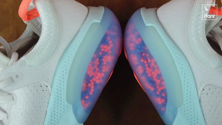 在谈耐克之前,还是要催促一下隔壁阿迪达斯,德国大厂抱着 Boost 这个缓震技术已经是新三年旧三年,换个配色名称又三年。耐克在缓震这块的想法和尝试就更为丰富一些,各种 Air 气垫老当益壮,而 React 门槛也一再降低款式变多,zzui近还联合 Air Max 搞了个 Nike Air Max 270 React 混搭款。 在新材料的尝试中,阿迪达斯此前也有 AlphaEdge 4D 这样把 3D 打印技术(准确说是连续液面制造 CLIP — Continuous Liquid Interface Production 技术)用在鞋子中底的应用,不过成本较高,并且缓震性能一般般,亮点是稳定性和支撑感较强。 刚好,相较于阿迪达斯,耐克的不少鞋子轻盈和软弹有余,但稳定和支撑略差。那么,今日要说的主角,耐克新出的 Joyride 能否四者兼顾? 如果说 React 缓震技术很明显地是告诉消费者这是主打「反馈」的话,那 Joyride 难道主打「骑乘之趣」?虽然听起来有点儿黄精品,但耐克是这么说的: 简言之,它适合轻松闲适的运动场景,主要是图个乐(Joy)。 作为这个技术的核心,相信大家也看到了,就是鞋底里的无数个彩色小球。耐克表示,他们从 150 多种材料里面寻找,终于找到了这个名为 TPE 的材料。听起来挺不容易的,但是想到爱迪生为了发明电灯尝试了 1600 多种材料,还是一个人在尝试,所以这么看耐克这么大公司的这个尝试也还能接受。 况且,TPE(热塑性弹性体)材料并不是什么天山雪莲,长白山千年老人参,而是一种相对来说应用比较广泛的材料,在汽车、家用电器、各种场景上都用得挺多,比如自行车车把的包胶、保温杯妇凤面的密封胶圈等等。 TPE 这种介于橡胶和塑料之间的材料,之所以能用在鞋底材料,还是因为它具有缓震性、抗压缩性和一定的强度。 那为什么要做成这么一个个的小球呢? 相比于一整块的中底,这些 TPE 缓震小球单个具有缓震性,几百上千个聚在一起,就有不小的适应性和延展性。 举个例子,我们可以把这些 TPE 缓震小球看成懒人沙发里面的小颗粒,通过小颗粒的流动再分配,懒人沙发就能适应人体的各种姿势。某种程度上来讲,Joyride Run Flyknit 跑鞋跟这个道理差不多,它也是让 TPE 缓震小球们在用户上脚穿着之后,再去塑形以适应用户的脚型和姿势。 看图也知道,在脚后跟部分的 TPE 缓震小球是zzui多,一般而言,各种缓震科技也会对这部分进行加强。 在第一次穿着的时候,可以很明显地感觉到,脚后跟和前脚掌两处的缓震小球堆积在一起,高出鞋底平面顶住了脚底,这个时候就需要唱跳 rap 和篮球活动一下,把聚集的小球门踩均匀,以获得和脚型适配的独一无二的缓震小球分布。 不过和懒人沙发有所不同的是,这些 TPE 缓震小球被分配在泡棉中底的四个仓位之中,防止小球们在足底过度位移平均分配,影响穿着感。 之前耐克首发 React 中底缓震技术的时候,与其搭配的是 Flyknit(飞织)鞋面技术。作为已经出现了十年的鞋面技术,完全可以说是流水的中底,铁打的 Flyknit。 这一次跟着 Joyride 首发的鞋面技术,依旧是 Flyknit。没办法,Flyknit 实在是太万能太百搭了,耐克在足球鞋、篮球鞋、跑鞋乃至休闲鞋都很喜欢用这个技术。 不过在 Joyride Run Flyknit 跑鞋上,耐克对 Flyknit 做了一些改进。 Flyknit 的主要特点是和脚掌的贴合度非常好,就像袜子一样,不过 Flyknit 会通过编织线材的密度以及编织方式调整鞋面的强度,毕竟在贴合度之外,鞋面也要保证稳定性。在以往,Flyknit 在鞋面脚踝处会通过内置或者粘贴其他较硬的材料,以保持这部分的稳定性。 到了 Joyride Run Flyknit 跑鞋上,耐克采用了另外的方法:Flyknit 鞋面编织物一直延伸到底,形成一整个「袜子」的结构。保护脚踝的任务就得另起炉灶了,于是耐克就在外部再做了一层更硬更刚的编织层。 这种双层结构此前在耐克的不少篮球鞋上用到过,目前跑步鞋有这种结构的,仅此一款。 需要特别说明的是,Joyride Run Flyknit 跑鞋属于偏紧的编织风格,日常穿着 42 码的我想要穿进 42 码的 Joyride Run Flyknit 跑鞋要比耐克的其他鞋子更费劲一点儿,所以建议有意购买的消费者买大半码。 同时,为了进一步提升稳定性和保护,Joyride Run Flyknit 跑鞋中底泡棉从侧边看的话,往上也延伸了不少。 穿进去这个鞋子之后,包裹感非常明显,因为本身鞋面的贴合度很高,因此鞋带基本上是个摆设,当然这跟它本身偏紧,加上我脚比较肉有很大关系。 前面说了,耐克的跑鞋总是轻盈和软弹有余,稳定和支撑略差。这一次 Joyride Run Flyknit 跑鞋针对稳定做了不少的工作,成效也确实明显,至少比当前耐克跑鞋主力当中的 React 和 Zoom 系列好上一档。 相比于 React 那种上脚走路感觉「陷进去」再慢慢「弹回来」的感觉, Joyride 可以明显感觉到 TPE 缓震小球的那种橡胶属性:有一些弹性,但弹得很顽强刚猛。换言之,就是弹性一般,回弹迅速,支撑良好。 如果就硬度来说,React 是 1,Boost 是 2,那么 Joyride 可以算作 3,而许多平价跑鞋(尤其是 New Balance)喜欢用的 EVA 发泡鞋底的硬度大概就是 4 了。 可以这么说,Joyride 的脚感并不会像 React 和 Boost 那样有乍见之欢的感觉,作为慢跑鞋或者日常穿着的话,脚感其实偏向于波澜不惊,但相比于很多 EVA 发泡鞋底来说,它可以察觉的弹性和迅捷的力反馈,并不会让慢跑和走路变得呆板无趣。 当然,作为一款跑鞋,Joyride Run Flyknit 跑鞋在轻盈上是完全合格的。 相比于日常打折,618 期间能在四五百入手的 React 鞋款来说,尝鲜价 1399 元的 Joyride Run Flyknit 
