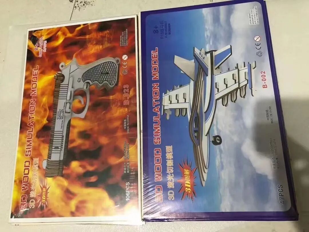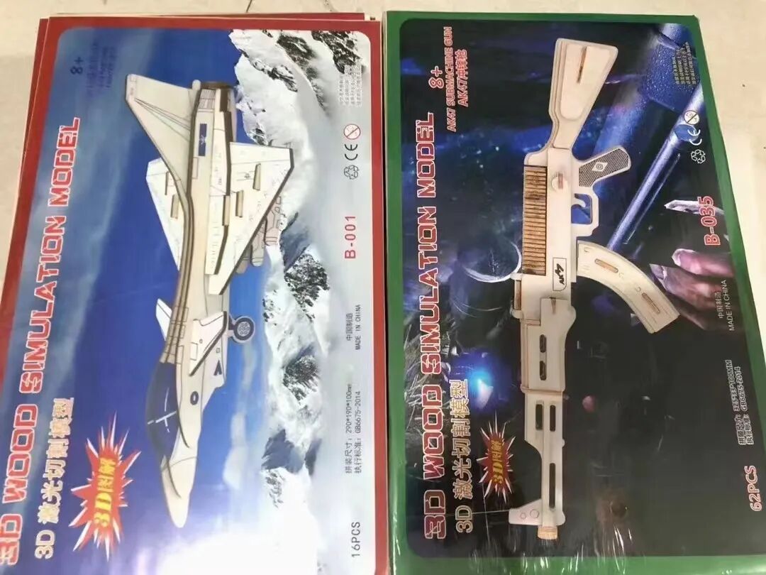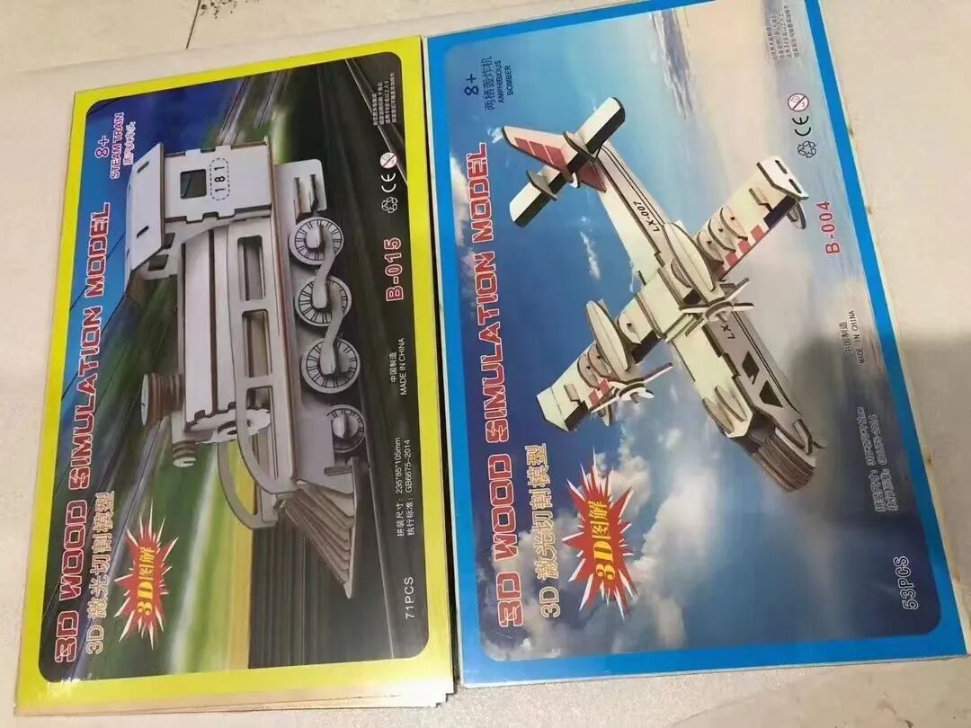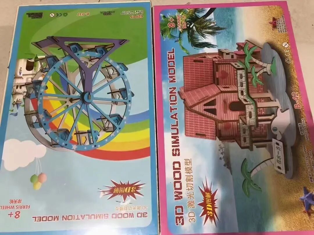 3D立体激光木质拼图,锻炼小盆友的益智、动手能力,增加亲子互动与交流,是小本创业的好产品,一件200个,5.5元一个,2件起批。图案混批、21*34尺寸,厂家供应。