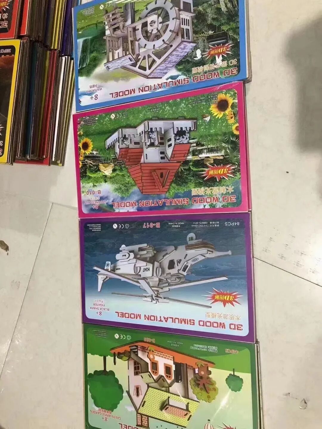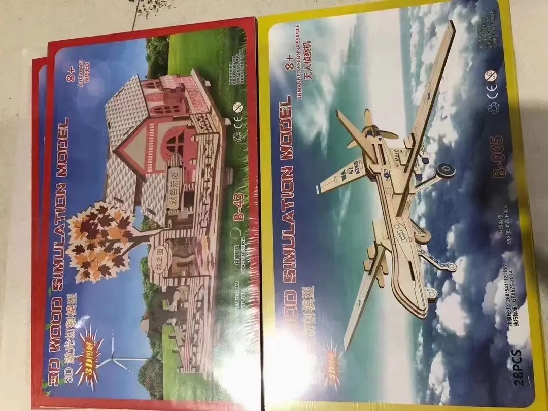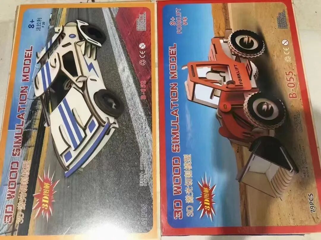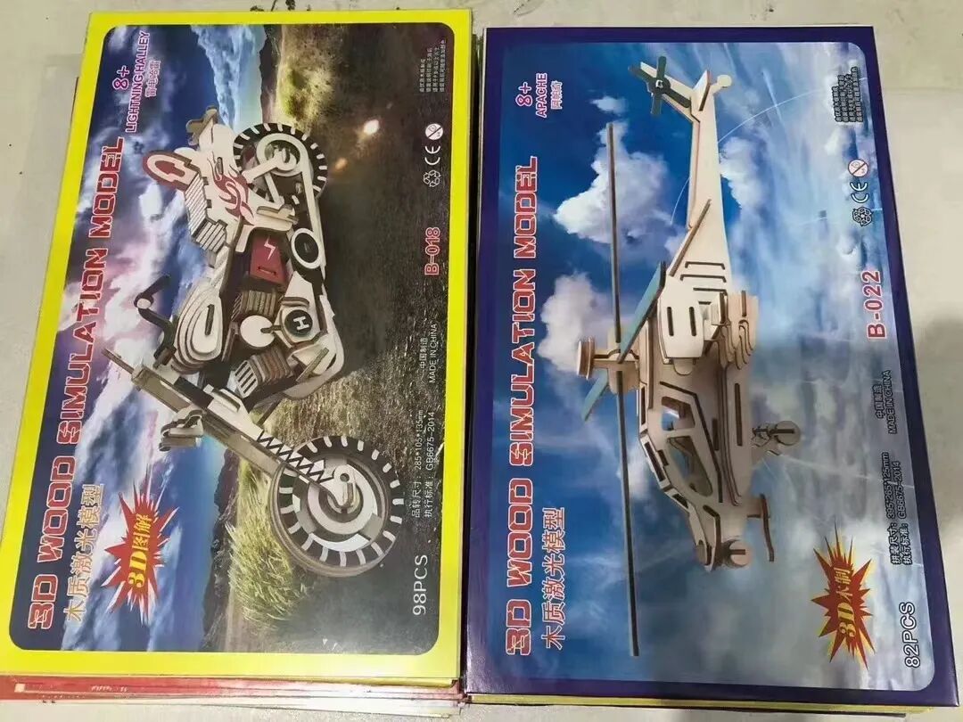 3D立体激光木质拼图,锻炼小盆友的益智、动手能力,增加亲子互动与交流,是小本创业的好产品,一件200个,5.5元一个,2件起批。图案混批、21*34尺寸,厂家供应。