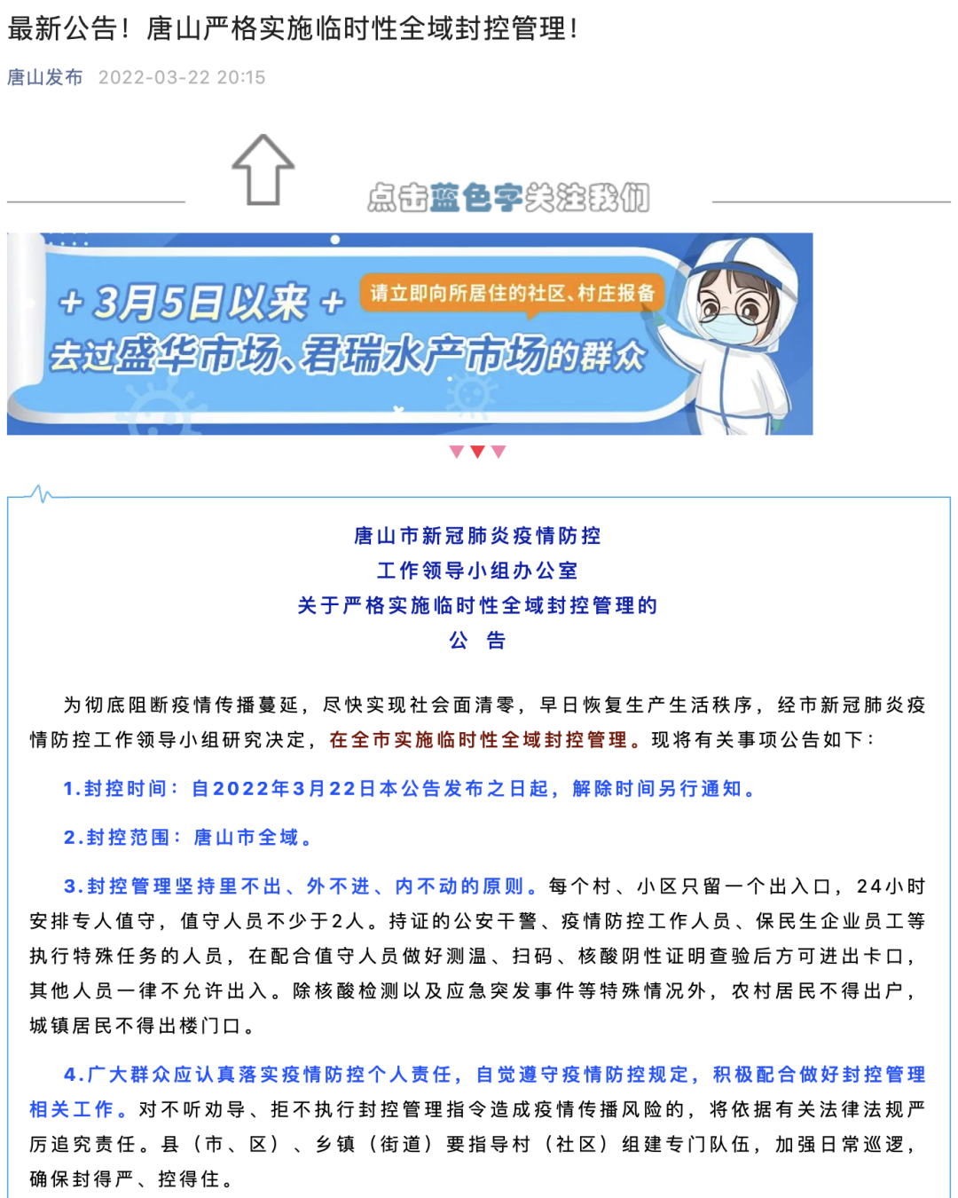 3月22日20时许,唐山发布《关于严格实施临时性全域封控管理的公告》:自本公告发布之日起,唐山市实施临时性全域封控管理。除核酸检测以及应急突发事件等特殊情况外,农村居民不得出户,城镇居民不得出楼门口。