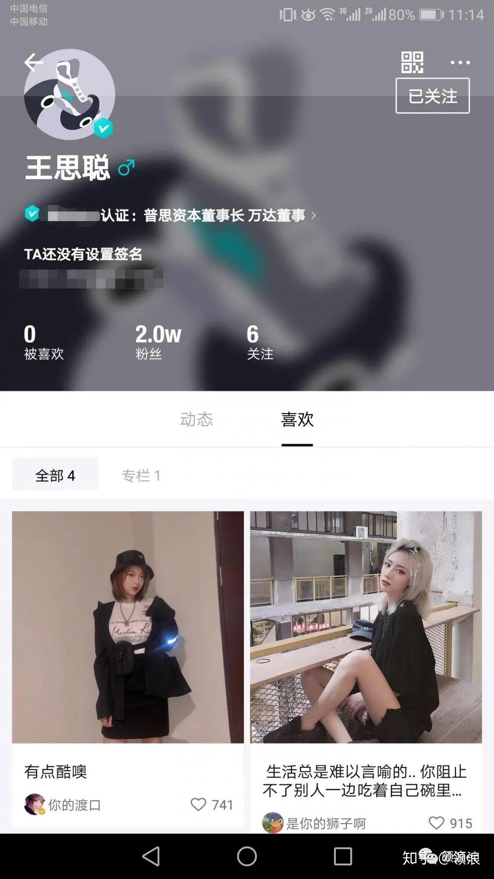 不出所料的,在该平台搜索“王思聪”的ID之后,匹配到一位加V的用户,并且这位用户还低调的使用着平台的默认头像,但认证信息却是高调的微博同款“普思资本董事长,万达集团董事”,再看校长的历史点赞,果然国民老公的关注点更多还是各位PLMM,潮流什么的也就图一乐,随便买买罢了。