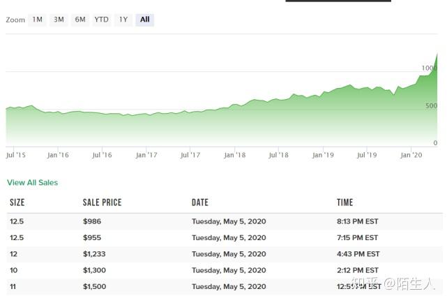 在过去的一年中,其中一个平台售出了914双,原价160美金,涨幅达712.3%。而且近期的涨幅最为突出。