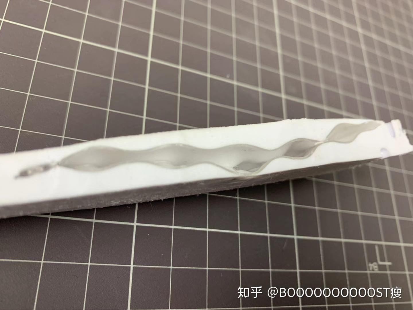 这是球鞋后跟部分的实拍。在图片中,最外层的蓝色是牛皮,上面已经介绍过,通过这个角度还是可以看到里面的牛皮纤维。中间部分是稍硬的支撑片,在行走的时候起到一个稳固脚跟的作用,与脚跟的弧度相一致。最里层的部分是内衬,也是最接触皮肤的部分,起到透气的作用,材料的选用会直接关系到舒适度。