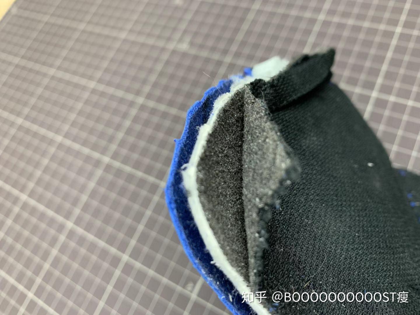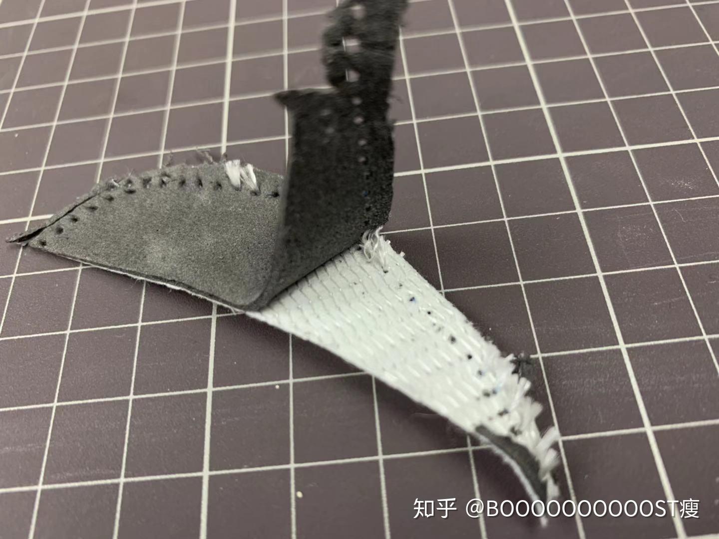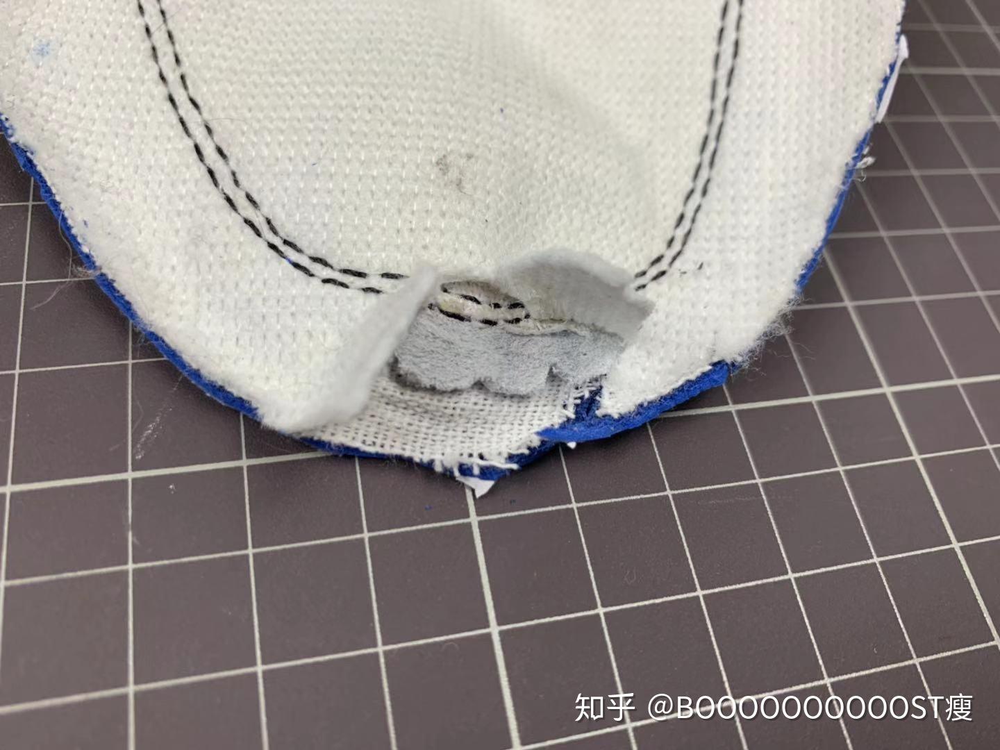 图片中的鞋头的拆解特写。从图片中可以看到,最外层的蓝色部分是鞋头边缘部分的牛皮,牛皮背面是一层内衬。内衬分为两层,一层是白色网布,二层是稍厚的内衬,都是对脚掌起到一个透气、舒适的作用。