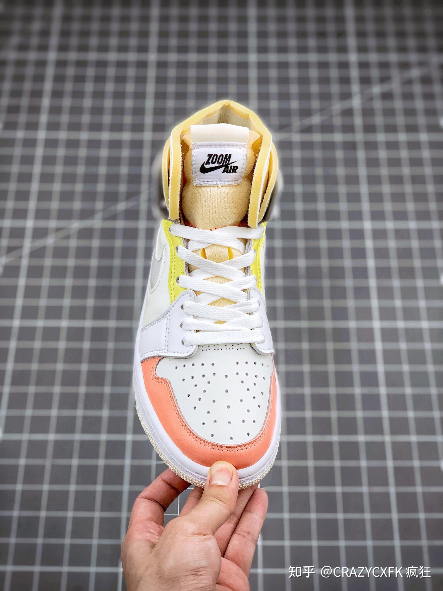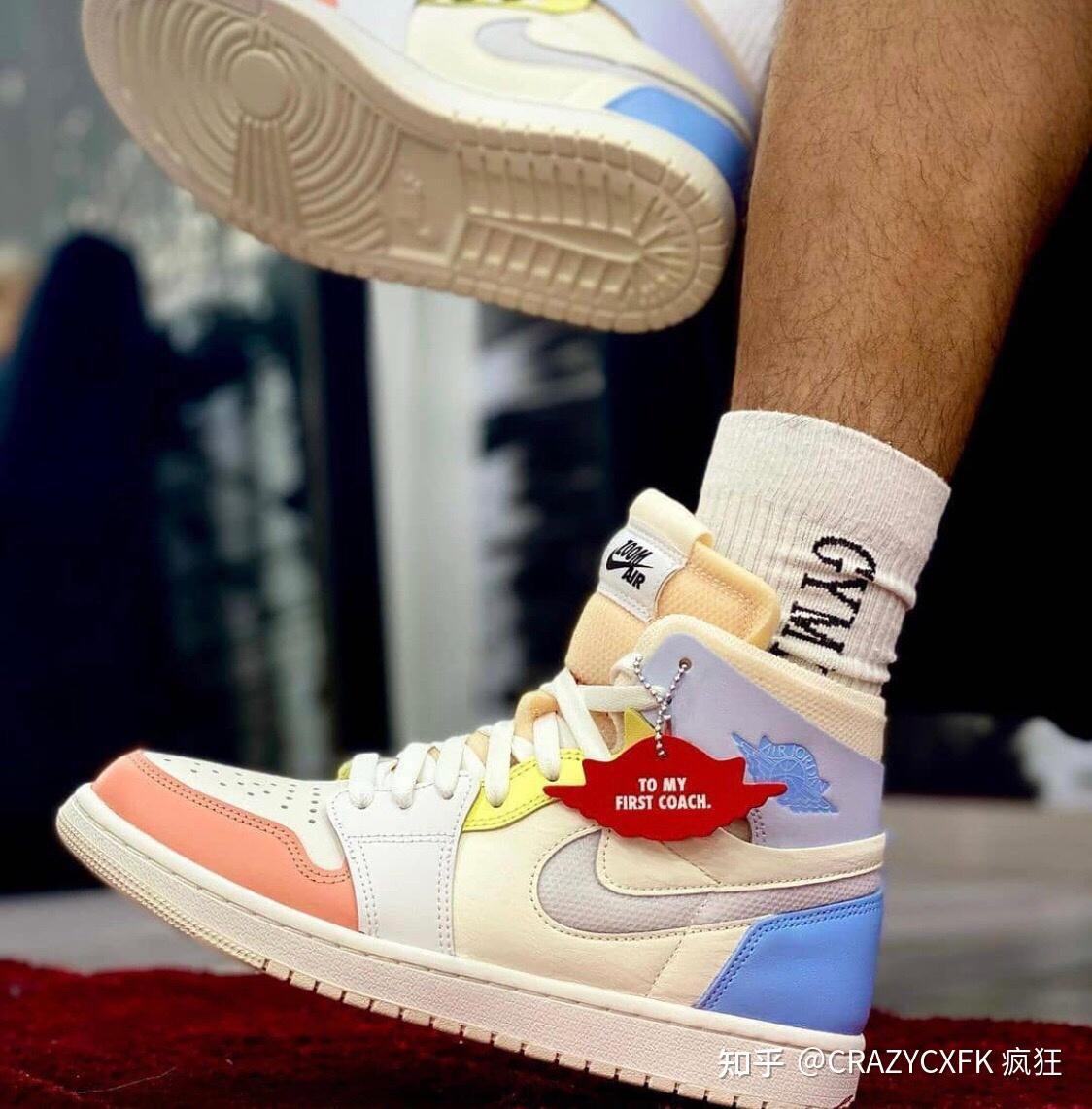 乔丹 Air Jordan 1 Zoom Air CMFT To My First Coach 白色拼接篮球鞋 DJ6910-100。搭载全掌 Zoom Air 气垫缓震科技。3M反光鞋身。飞翼 Logo下方 Zoom 标签。鞋舌Zoom Air字样。脚感相比之前的 Air Jordan 1 有了强化,穿鞋头像示意。