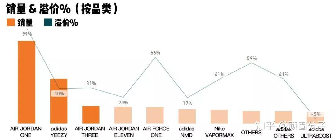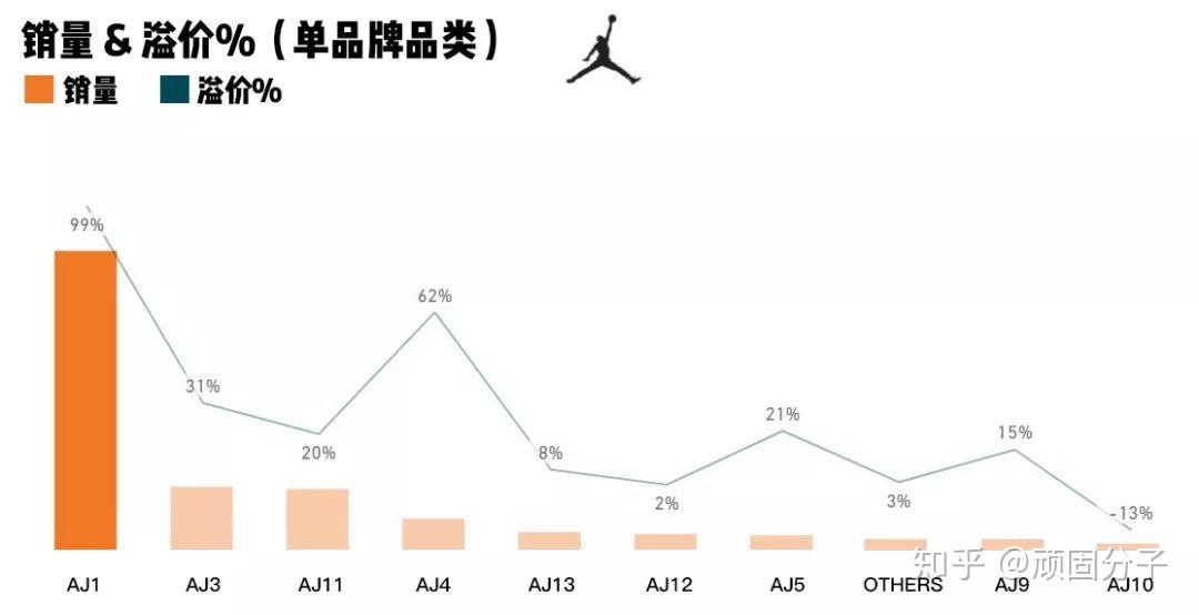 从StockX的数据来看,AIR JORDAN 1对比JORDAN BRAND的其他款式完全是碾压式的存在。而通过二级市场的销售数量及溢价率也能看出消费者对于AJ1的追捧——AJ1的销量甚至超过了其他所有的AJ款式之合,超过99%的溢价率也遥遥领先其他的AIR JORDAN鞋款。