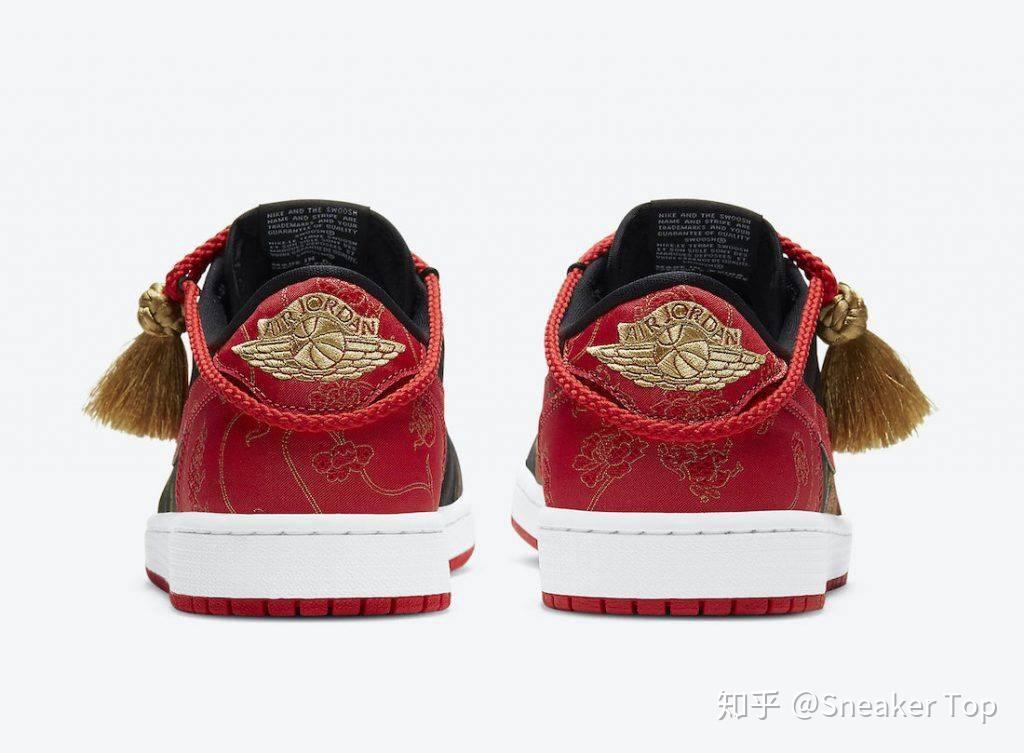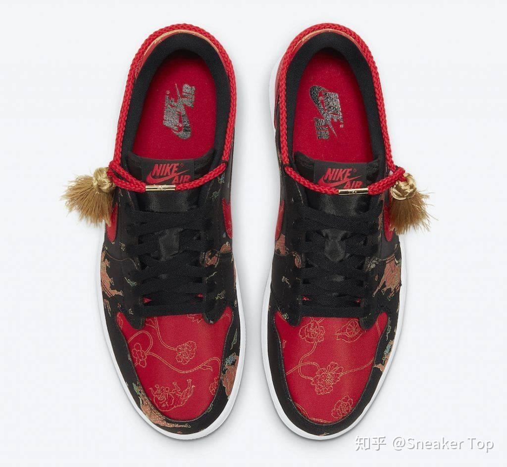 首先,全鞋的图案均以绣线绣上,并非普通印刷便草草了事。在黑色的尼龙帆布面上,绣上了很多牛和少许花、草的图案,以代表2021年中国生肖年,并向这文化致敬,还要选用了彩色绣线,诚意满满。红色的尼龙帆布面与黑色的分别在于单纯使用金色绣线刻划图案的轮廓,但图案的种类比黑色的多,除了牛和少许花、草,还加上了Jordan的飞翼logo和设有更多的大花朵图案,细致的设计绝对征服大部分鞋迷。最后,在围绕鞋筒的部分系上了一条红绳,并连接一个金色大结,配合鞋跟绣上的全金Jordan飞翼logo,更凸显华人在节日的奢华,并令整体感觉升华。