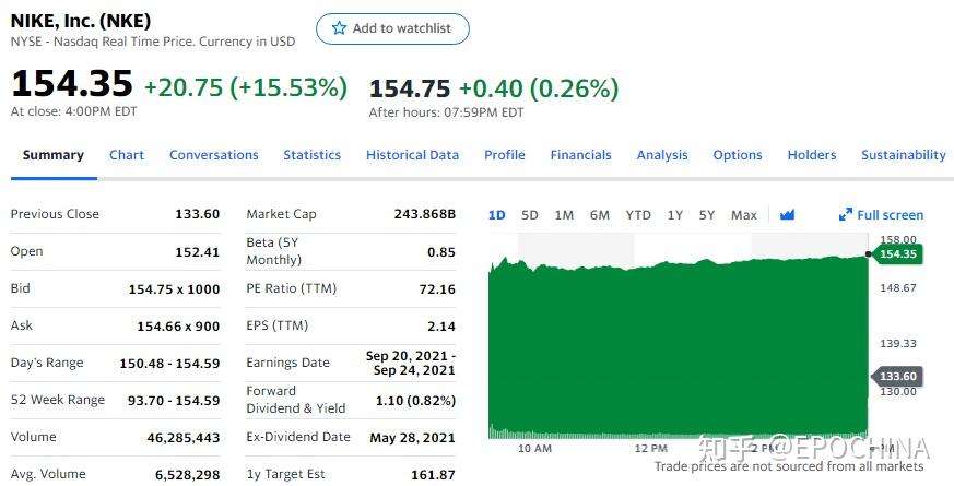 受此影响,耐克周五股价大涨15.53%,达154.35美元。