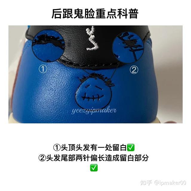 鞋身采用经典的藤原浩蓝白色调, 后跟有Travis Scott与藤原浩的鬼脸与闪电logo,