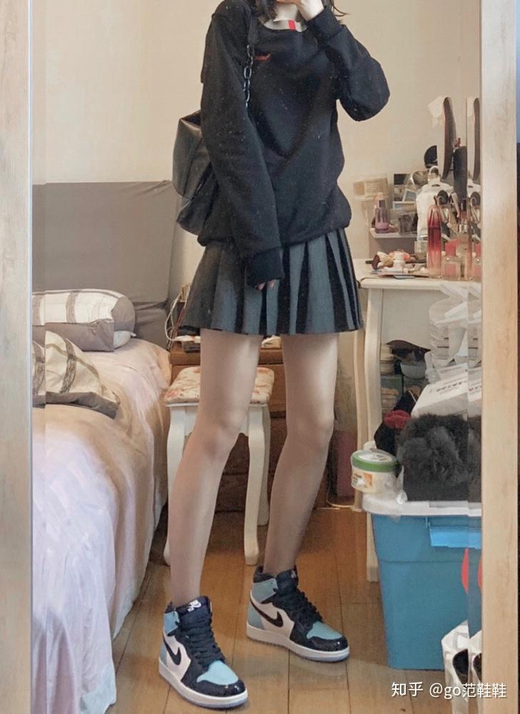 GO范(够范):百褶裙和包裙相比起来,褶皱部分更显俏皮可爱,更适合搭配AJ1这种休闲的鞋子,上衣可以是卫衣也可以是T恤~需要注意的是,AJ1的配色已足够出彩,裙子最好选择纯色系,可以是黑色灰色系的。