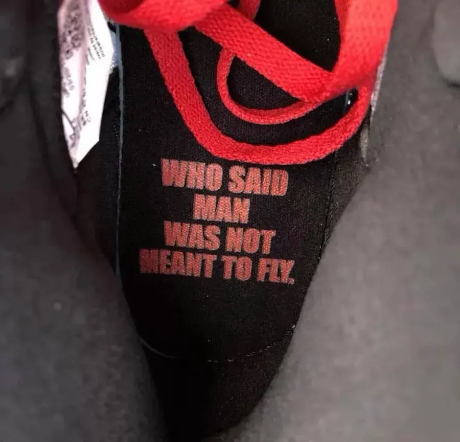 这一版本采用了经典的“BULLS”公牛主题配色,以黑白双色荔枝皮构成鞋面,并在轮廓处加入红色勾边,再搭配上白色中底及深红色外底,有点类似于之前的AJ1兔八哥。而整个鞋款的点睛之笔就是鞋垫上的“Who Said man was not meant to fly?”反问式标语。