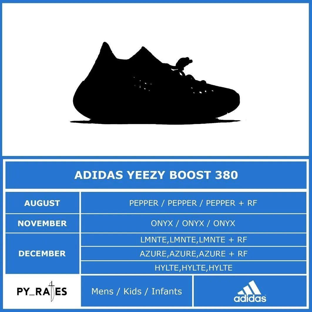 此番,爆料账号py_rates于其个人社交媒体释出了将于今年内发售的adidas Originals YEEZY BOOST 350 V2和380的配色方案预告。从上面我们可以得知,350 V2将分别于6月、9月、11月以及12月有四款全新配色登场,6月发售的正式我们昨日为大家曝光的「Israfi」,其余配色暂无实物图曝光;380则将于稍晚的8月、11月以及12月发售5款配色,其中有三双鞋款将配有满天星版本。可以预见的是,今年的YEEZY系列还将持续轰炸我们的钱包,各位不妨赶紧存钱吧~