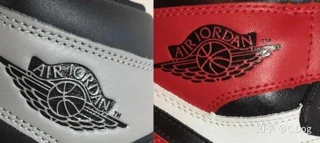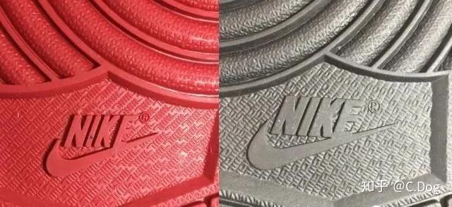 AJ圈里有一个人人皆知的鉴别方法,就是真AJ的字母“R”和字母“D”下面是相连的,而假AJ是分开的。然而,有时候假货也能注意到这一点。把真假AJ放在一起对比(灰真红假),你会发现这个假AJ的logo工艺其实也挺好。假AJ的图案完全是对的,只不过真AJ的logo浮雕比较深,假货都做到这个份儿上了,的确是真假难辨;但是如果你看的再仔细一些,你会发现真假AJ的RD相连处还是不一样的。左侧的正品相连处细小平直,右侧仿品那个R的“腿”上下一样粗。此外,正品的logo边缘干净,色彩界限分明。仿品logo的边缘有墨色沁染的现象,有“毛边”效果。