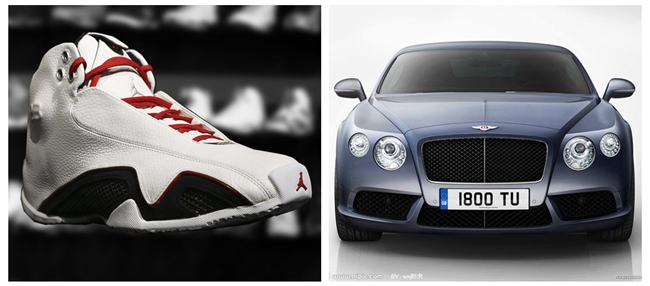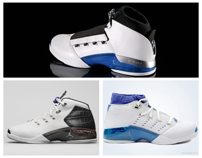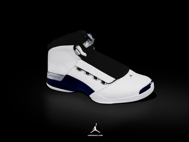 球鞋介绍:AJ17将爵士乐和纯贵族血统的英国阿斯顿-马丁汽车为灵感融入其中,奢华、昂贵成为其代名词。17代延续了16代的鞋套设计,鞋面上两侧各有两排鞋带孔,外侧的鞋带孔就为搭扣鞋套用。材质上采用了韧性极好的织物材料和合成皮。科技方面,前掌的Zoom Air气垫搭配后掌的新式Blow-molser Air气垫,轻质的Phylon中底,全掌的TPU承托盘,这些都使得17代性能优良。而在鞋的中部,蓝色的TPU层中若隐若现得飞人标志和银色的后跟稳定条上的jordan字样,更是兼备性能和外观得经典设计。