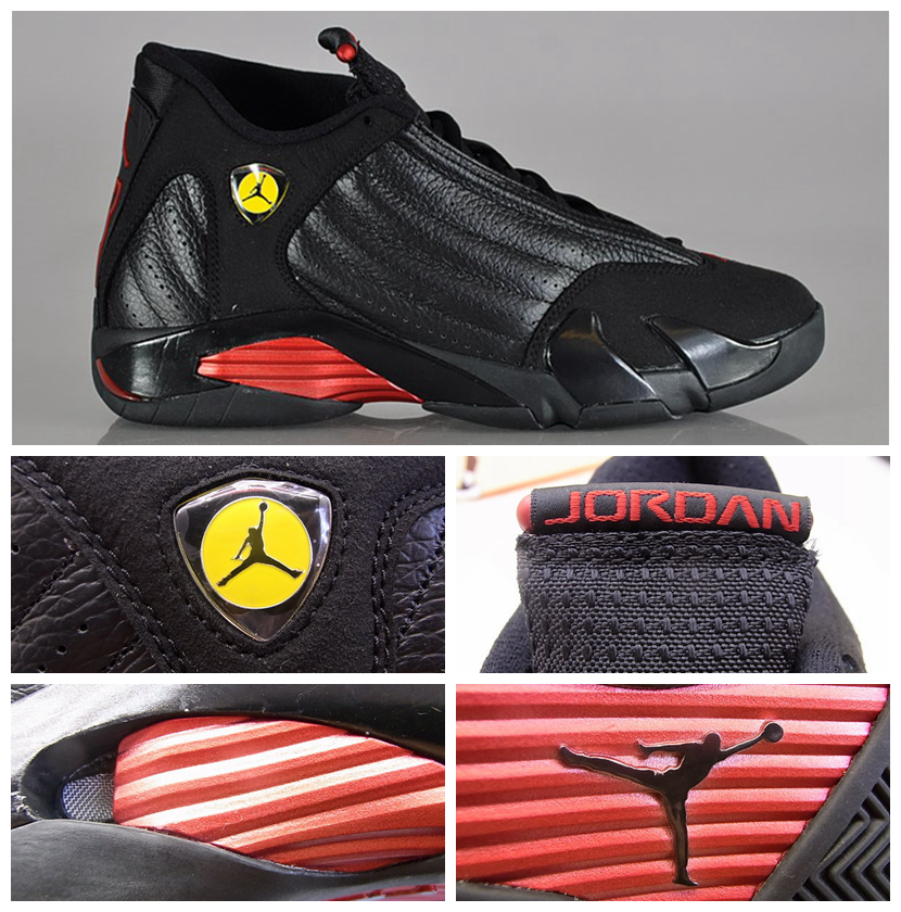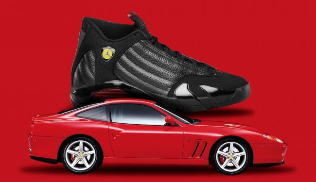 球鞋科技:Air Jordan 14造型灵感来自于乔丹的爱车法拉利M550,鞋身线条犹如跑车般流畅,全粒面皮革鞋面提供了稳定包裹与支撑,并将法拉利标志性的通风口移植到鞋面中,增加了鞋子的透气性,鞋身Logo采用了与法拉利相同的盾牌设计,沿用汽车轮胎的人字花纹也使抓地力有了显著提升。