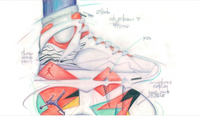球鞋介绍:Air Jordan 7在设计中首次将Huarache理念注入其中,加入了全新的内靴设计和镂空鞋身,保证包裹同时减轻鞋身重量。