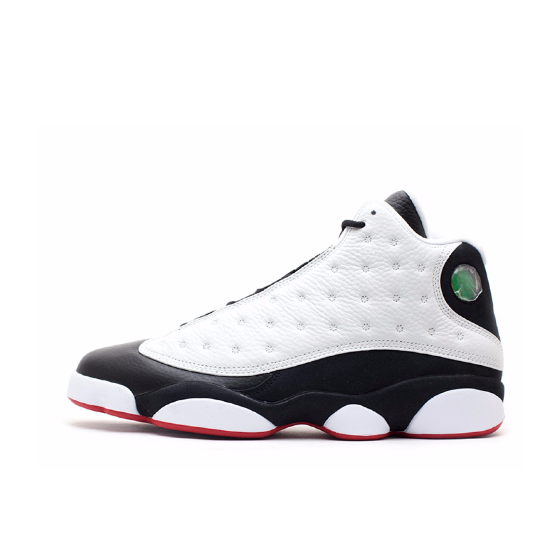 球鞋介绍:Air Jordan 13在外观设计上采用了简约式的风格,流线型的鞋身,鞋面类似于豹皮斑点的花纹,犹如猎豹脚掌般的鞋底,以及鞋帮处加入的激光三维技术制成的仿豹眼“飞人”全息Logo,无不都是让人拍手叫绝的设计,可以说AJ 13将猫科动物身上的那种灵动且极富攻击性的特点进行了惟妙惟肖的演绎。中底采用的前后掌分离Zoom Air,配合中部碳纤维板,也拥有强大的实战性能,而外底则大胆的模仿出黑豹强韧而矫健的脚掌更是刷新了人们对球鞋的认知理念。
