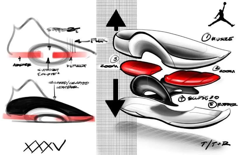 外观特点:中底镂空+承托盘“日冕”设计;致敬AJ5鞋型