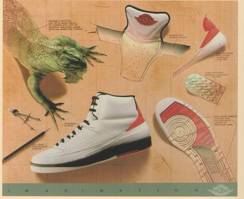 小故事:在当时耐克所生产的球鞋侧边几乎都是清一色的大勾子,即便是AJ1也不例外。而乔2不但取消了鞋身侧边的大Swoosh Logo,而且将飞人专属的飞翼LOGO移到了最醒目的鞋舌部位(与此同时这也是飞翼Logo在Air Jordan系列中的最后一次演出,直至AJ32为了致敬AJ2才再次出现),这一淡化Nike 品牌形象,强调Jordan个人色彩的举动,间接的告诉消费者,这是Jordan的而非Nike的,说明耐克有意向把Air Jordan 塑造成一个全新的品牌。