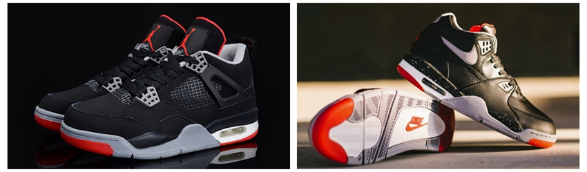 外观特点:皮质和尼龙网格结合、鞋带孔和后跟鞋提以篮网为造型灵感、鞋舌Flight字样LOGO