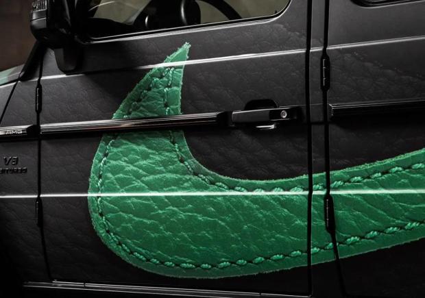 黑色皮革部分、鞋带与白色中底形成鲜明对比,鞋舌部位的红色Nike Air品牌标志传承经典的设计理念。而这台AMG G 63的车身涂装同样展现出皮革质感,对勾Logo、气孔、缝线等设计元素表现的惟妙惟肖。