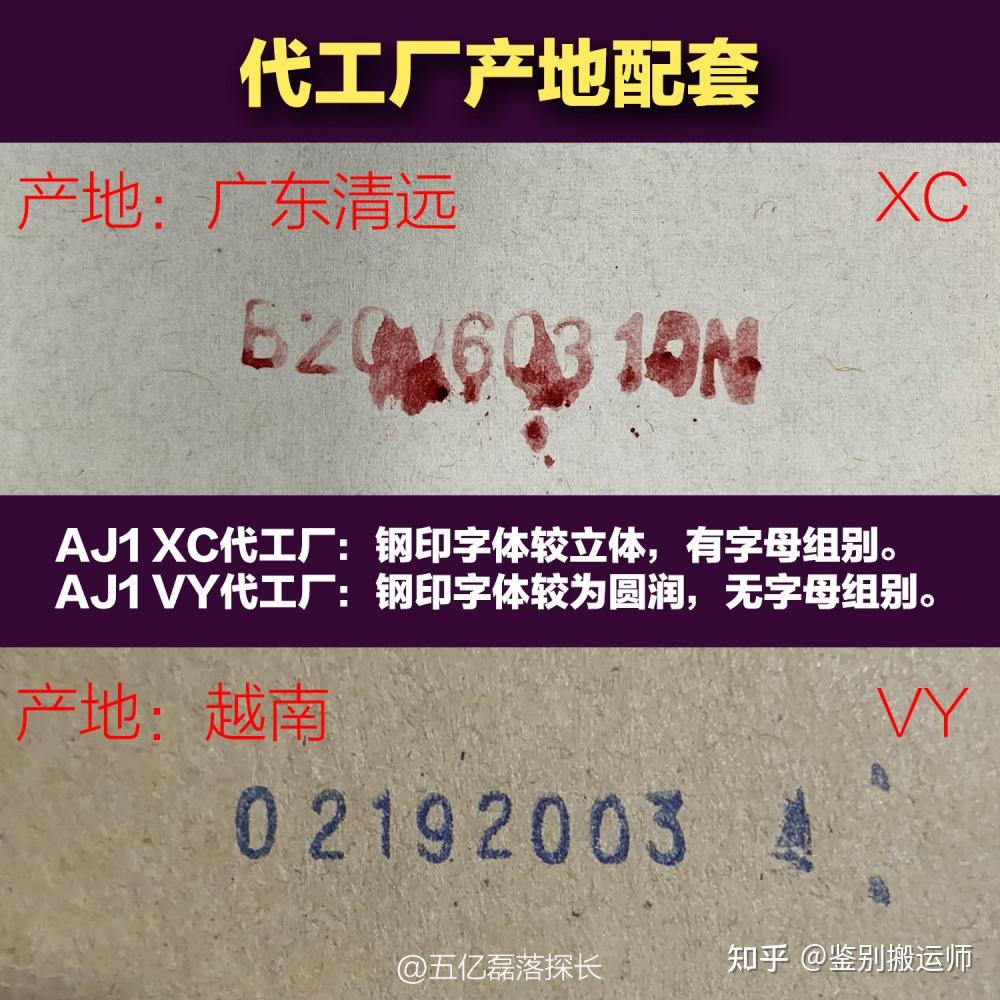 aj1钢印产地配套: aj1 xc代工厂:钢印字体较立体,有字母组别。产地:广东清远 aj1 vy代工厂:钢印字体较为圆润,无字母组别。产地:越南