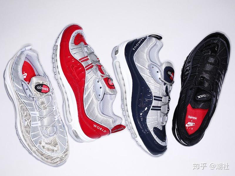 Air Max 98 在当时算是一个较为冷门的鞋款,此次的 Supreme 联名可谓拯救了这款鞋。直接一口气推出了四个配色,这是在之前的联名之中很少见的,正常情况下都是同款鞋型仅推出两个配色。