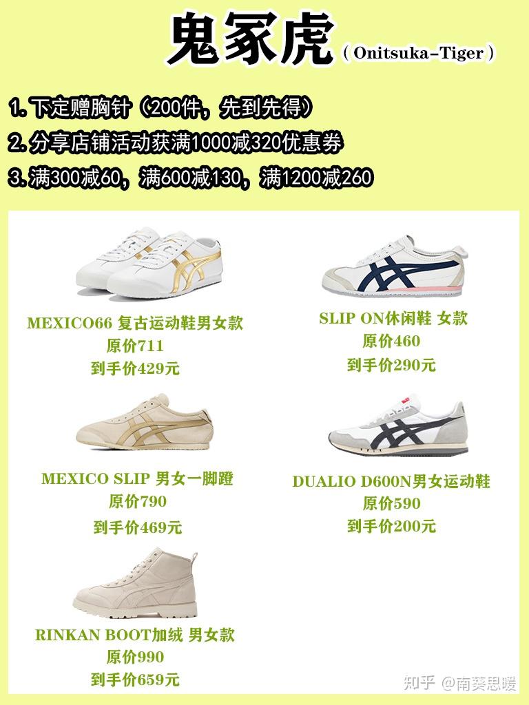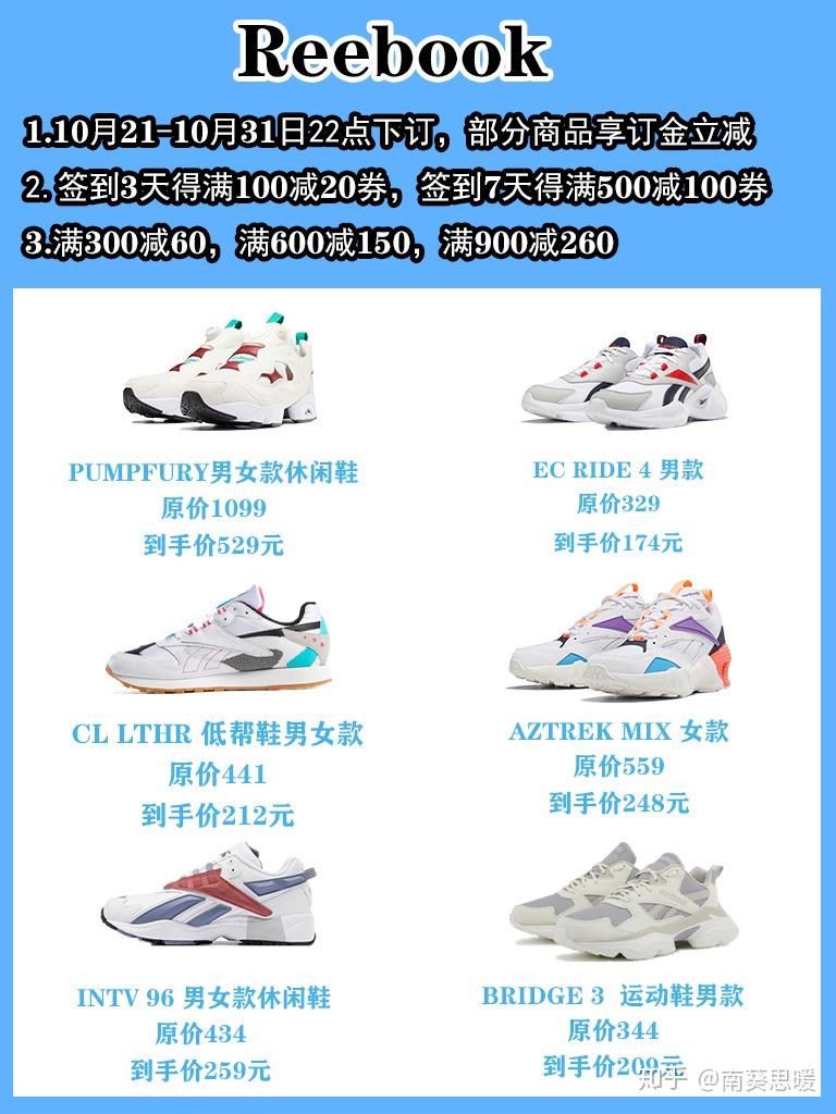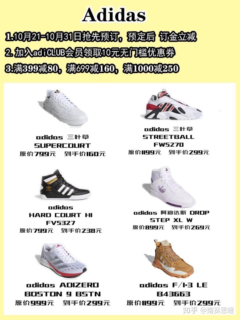本文收录跑鞋15+,文章字数和链接插入较多,建议收藏后再阅读研究,也可分享给身边有需要的小伙伴。文章由浅入深的介绍各品牌各个系列不同的鞋品,希望能够给刚好想要入运动鞋的你一些中肯的意见。如下是本文的目录大纲: adidas NIKE Reebook 新百伦 鬼冢虎 1、adidas 阿迪达斯 三叶草 SUPERCOURT 男女鞋运动鞋 原价799元,11月1日0点:拼单券后160元 复古小白鞋。 adidas 阿迪达斯 三叶草 SUPERCOURT 男款运动板鞋,汲取40年来的网球鞋款设计,采用网球式白色皮革鞋面,缀打孔三条纹和雕刻感杯底,系带款式,干练有型。 京东1日预计到手209元,凑单1000-300元低至160.3元,购买其他商品的可以凑单带回。 2、adidas 三叶草 STREETBALL FW5270 原价1199元,11月1日0点:券后299元包邮 这款adidas Streetball经典鞋,致敬从街边野球场对战中脱颖而出的黄金一代。采用层次感皮革鞋面,搭配反光细节,演绎90年代复古风格。 中国春节系列,系带设计,皮革鞋面,织物衬里,橡胶外底,助你轻松迈步。 京东adidas官方旗舰店11月1日活动价359元,领券叠加300减60元优惠,1日-3日预计到手价299元包邮。 3、adidas 阿迪达斯 HARD COURT HI FV5327 男女款经典运动鞋 原价799元,11月1日0点:券后238元包邮 橡胶外底,耐磨防滑。 adidas 阿迪达斯 HARD COURT HI FV5327 男女款经典运动鞋,常规型剪裁,系带设计,简约时尚,合成鞋面,橡胶外底,耐磨防滑,网材树里,乙烯/乙酸乙烯酯(EWA)鞋垫。 京东adidas官方旗舰店11月1日活动价259元,领券叠加20元优惠,1日-3日预计到手价239元包邮,感兴趣的朋友不容错过~ 4、adidas 阿迪达斯 DROP STEP XL W 女子运动鞋 原价899元,11月1日0点:券后269元包邮 醒目三叶草logo,休闲时尚。 此款adidas 阿迪达斯 DROP STEP XL W 女子运动鞋,采用合成材质打造鞋面,搭配织物衬里,上脚舒适柔软。鞋面点缀大号三叶草logo,醒目时尚。 京东adidas官方旗舰店此商品预告1日活动价289元,下单可使用首页满25-20元粉丝券,预估到手价269元包邮,入手好价。 5、adidas 阿迪达斯 F/1.3 LE B43663 男款运动鞋 原价1199元,11月1日0点:券后299元 外底形似电锯,脚感舒适。 此款adidas 阿迪达斯 F/1.3 LE B43663 男款运动鞋,采用正绒面革和绒面革鞋面,为徒步鞋注入街头时尚,外底采用形似电锯造型,力求脚感舒适。 京东adidas官方旗舰店此商品预告1日活动价359元,下单可使用首页满25-20元粉丝券、300-40元京贴,预估到手价299元包邮。 6、adidas 阿迪达斯 ADIZERO BOSTON 9 BSTN 男/女子跑步运动鞋 原价999元,11月1日0点:券后299元 专业跑鞋,单买低价。 adidas 阿迪达斯 adizero Boston 9 男款跑鞋,Microfit拉伸网材鞋面,力求打造“第二层肌肤”般的舒适脚感,搭载Boost和Lightstrike技术,灵活缓震,Continental马牌橡胶外底,防滑耐磨。 京东此款1日预告价为299元,低至原价3折,届时凑单叠加大额券,价格更优惠~ 1、AIR JORDAN WHY NOT ZER0.3 PF CD3002-006 男子篮球鞋 原价1099元,11月1日0点:券后268.71元 锁定设计,泰然稳固~ 在球场上,拉塞尔·威斯布鲁克始终保持着无所畏惧的能量。他即将把这种能量带到芝加哥的全明星赛当中——理所当然也带来了他的专属签名鞋款。这款 Why Not Zer0.3 特别版采用明亮的霓虹颜色搭配,使其充满了 90 年代的风情。后跟搭配爆裂纹图案,意在向改变风之尘泛球历史的迈克尔·乔丹致敬。多种元素融为一体,以此致敬威斯布鲁克根植于加利福尼亚的不羁风范。 京东平台有售,1日活动价689元,2件8折、合理凑单使用1000-220专享券, 1000-100粉丝券(在首页),900-90品类券(在首页)低至268.71元,优秀好价,感兴趣的朋友不容错过。 2、NIKE 耐克 LEBRON XVII EP BQ3178 原价1599元,11月1日0点:券后497.1元 詹姆斯战靴,呈现盘旋图案。 NIKE 耐克 LEBRON XVII EP詹姆斯17 BQ3178 男子篮球鞋,LeBron XVII EP篮球鞋依托勒布朗的力量和速度,塑就出众的包覆性和支撑力,组合缓震设计,为勒布朗带来出色减震支撑效果和灵敏响应回弹能量。Flikint结构和模压纱线组合而成KnitPosite,呈现盘旋图案。轻盈耐穿富有支撑力。后跟搭载MaxAir缓震配置,前足ZoomAir缓震配置,宽版鞋口搭配传统鞋舌,易于穿脱。 京东1日活动价979元,0-2点限时9折,平行凑单26元袜子 可使用1000-100元粉丝店铺券,叠加1000-220平台优惠劵 900-90品类券 实付497.1元,相当于买鞋送袜子,如果有1000-120元粉丝券可以做到更低,喜欢的朋友可以关注。 1、Reebok锐步经典PUMP FURY FU9106 原价1099元,到手价529元 这款男子运动鞋从北京菜、北京烤鸭中汲取灵感。鞋跟拉片上印有城市的简称“京”字样,打造精品感。鞋舌上的复古pump打造篮球鞋造型,力求舒适。 纺织面料鞋面,“一脚蹬”设计方便穿,Hexalite蜂巢科技,Pump技术力求舒适贴合鞋垫更添舒适,橡胶大底。 2、 Reebok Royal EC Ride运动鞋 原价329元,到手价174元 3D中底设计与大 Vector徽标给予这款鞋复古感。 FuelFoam科技中底提供舒适脚感。织物鞋面方便轻松穿脱。 纺织面料鞋面,舒适的 FuelFoam科技中底,低帮设计。 3、 Classic Leather ATI 90s 原价699元,到手价212元 再经典的设计也需要再雕琢。这是80年代初版鞋的改版款。这款鞋的改造灵感源自 Reebok90年代的跑鞋,如 Aztrek系列结果成就了这样一双经典鞋款。EVA中底,力求舒适 经典设计新诠释,麂皮、合成材料和织物鞋面可拆卸EVA鞋垫,EVA中底,力求舒适,橡胶大底。 4、 Aztrek Double Nu Pops运动鞋 原价559元,到手价248元 一款将未来元素融入经典设计的90年代 Aztrek风运动鞋。这款女子运动鞋采用叠层的中