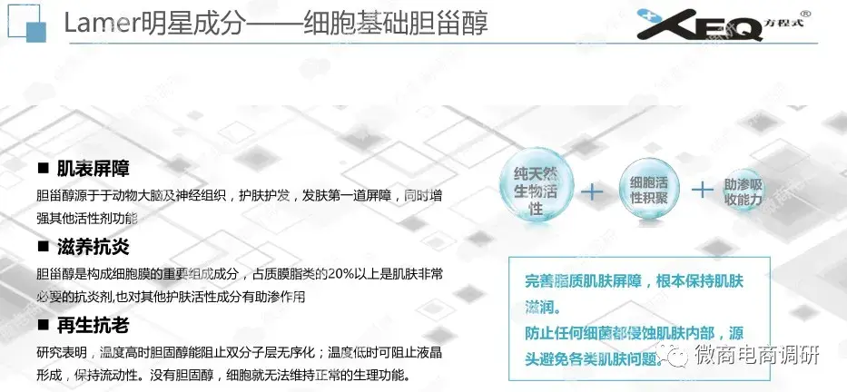 除了佳茵,德沃微商旗下另外一款引人注目的产品就是“玻尿酸”了。关于该产品,有相关PPT显示,该产品所含有的成分“细胞基础胆甾醇”具有抗炎功效。“抗炎”这个关键词也明显涉及到了医疗作用,但调查发现,这款名为“XEQ方程式 酵母玻尿酸精华液”的产品的备案编号为粤G妆网备字2020015642,显然,该产品只示氟产非特殊用途化妆品。