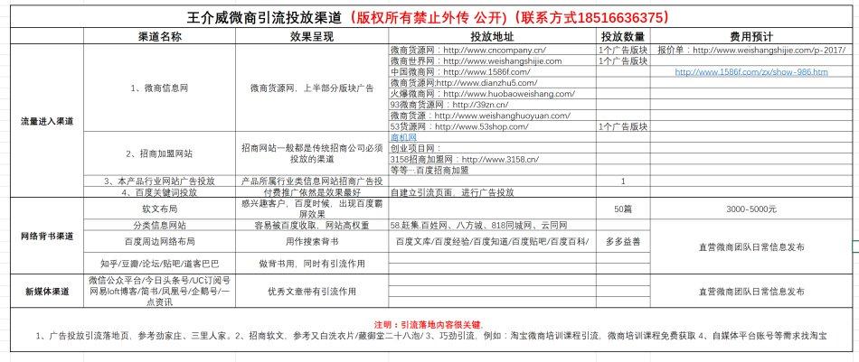 平常很多项目的微商操盘手给我打电话,“王介威老师,现在我镁帆司的项目在做微商,现在想进行网络引流,您有什么好的建议吗?”这是有关于网络引流,我被问道的zzui多的问题。 很多第一次操盘微商项目的操盘手,一般都会碰到这个问题,不知道该如何进行网络引流,今天主要给大家分享一下这个课题,微商起盘如何进行网络引流。 对于微商企业来说,新增代理人数是一个重要的指标。新增代理意味着微商团队的扩大,直接关系企业的产品销量。 一般来说,新增代理渠道主要是以下三个重要渠道:一是,老代理商的自主招商,代理商的自主裂变;;二是,网络引流带来的感兴趣意向客户,留到分配到公司直属团队,直属团队进行沟通转化;三是,招商会议带来的新增加代理商。 在微商开始的前两年,也就是2013年和2014年,微商新增代理人数,主要代理代理商的自主裂变,2015年新增代理商主要来自网络引流带来的意向客户转化,2016年,开始各家微商企业开始进行线下会议招商,招商变成了新起盘零基础微商企业新增代理商的主要来源渠道。 今天我们主要讨论一下新增代理商的第二个渠道:网络引流带来的感兴趣意向客户,留到分配到公司直属团队,直属团队进行沟通转化。 第一、微商网络引流,仅仅是在网络上发广告吗? 其实微商网络信息的投放,要分为两大步,第一步是做网络背书,第二步才是网络引流。 所以微商企业的网络引流,不是简简单单的网络引流,要先做背书,再做引流。 这个程序一定不能错,错了程序会造成很大的投入损失。 第二、应该如何进行网络背书的信息投放? 网络背书的意思就是,当对你产品感兴趣的用户去网上进行搜索你产品名称关键词或者你公司名称关键词,或则你产品进军微商相关报道的时候,网上会有相关的介绍。 网络背书信息的投放一般分为这么几个板块: 1、软文信息投放。可以写几篇本产品或则本公司进军微商的相关报道,然后通过软文发布在网上,软文投放可以使信息快速出现在网上。 2、自媒体平台信息发布。例如:微信公众平台/今日头条号/UC订阅号/网易loft博客/简书/凤凰号/企鹅号/一点资讯。自建自媒体可以进行发文,被百度所收录。但自建自媒体时间太长,可以找自媒体代发,找淘宝。 3、论坛贴吧发帖。在各种论坛贴吧发帖,可以被百度收录。自己发帖需要花费大量人工,这事找淘宝。 4、分类信息网站信息发布。这类网站容易被百度收取,网站高权重,比如:58.赶集.百姓网、八方城、818同城网、云同网。 5、百度周边网络布局:百度文库/百度经验/百度知道/百度贴吧/百度百科/百度图片/百度空间。 6、社交社区文库平台:豆瓣/知乎/道客巴巴/360图书馆/百度文库/ 第三、网络引流流程步骤设计 网络引流是一个流程,并不是把广告投放在网络上渠道这么简单,网络引流主要涉及三个流程,第一步:引流广告投放渠道;第二步:引流落地页内容设计;第三:直营团队沟通转化话术。 三者缺一不可,三者一方没有做好,直接会造成引流成本增加,和引流工程失败。 (一)网络引流渠道 在下一部分,我会专门去讲,这一节省略。 (二)引流落地页设计 对于引流落地页内容设计,这一点我认为是重中之重。流量落地页的设计是否有吸引力,这示坟于流量进入后,是否会进行添加微信号并且进行产品的咨询。(很多文章写道这里就结束,给你指出问题,却不给你解决方法) 对于如何设计落地页,我们要抓住一个微商创业者的群体特征属性,微商创业者是草根创业者,草根创业者想的是希望看到和他一样草根的人通过这个项目或则这个平台实现了由草根向高富帅的转变。草根创业者意味着经商经验有限,创业能力有限,他希望你这个项目可以帮助他,并且可以让他很轻松就可以赚到钱了。 现在来说设计一个具有吸引力的引流落地页主要分为这么几个板块: 第一,以人物做推广主体,打感情牌。很多微商企业的招商网站主要以产品和公司背书为主体,这是一个不具有吸引力的落地页,你的产品不会直接吸引一个意向客户成为你的代理。打感情拍,打人物拍,让微商创业者看到的是:1、创业人物的过去经历,找到共鸣——2、创业故事,看到希望——3、获得成功,自己一直期盼的。 第二、看到品牌方微商团队的热闹场景。可以是团队集会场景,可以示帆司场地规模,可以示帆司广告投放,可以是收款现金场景,也可以是代理商成功买车买房场景。图片展示 第三、微商培训体系,裂变体系、管理体系、成交体系,帮扶体系,话术体系、微商引流效果截图。草根创业者所关心的是,“我有梦想,我自己什么都不会,你能帮我吗?”所以你要告诉他你是真有技术,真有方法,有办法以zzui快的速度,zzui有效的方法,zzui容易学到的技能,教会他做微商,让他快速赚钱,快速成功。 第四、引流到个人微信号,创始人的个人微信号,很多意向代理商,并不是简单引流过来就可转化成交。需要时间进行潜移默化的成交影响,比如看到你朋友圈的动态,后期逐渐成为你的代理。 这一块就简单说这些,后期我们写一篇专门介绍如何设计引流落地页的指导文章。 (三)成交转化话术 引流引进来了,如何通过标准化的话术进行成交,这是引流的第三步。 直营团队的设立主要功能就是承接流量转化,制作好转化素材,转化话术,是直营团队工作的工作工具。 我这里有一本三里人家直营团队的内部转化话术手册,你如果